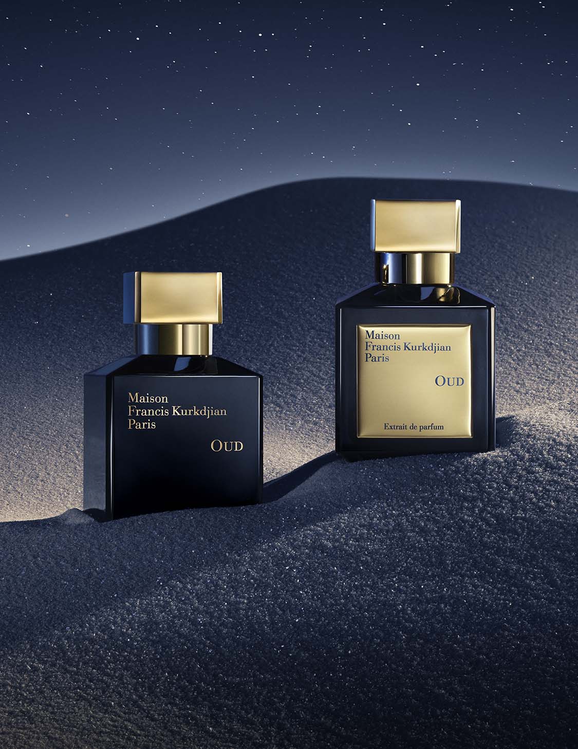 OUD se construye en torno al más preciado de los ingredientes, una madera de oud, soñada en las afueras de un palacio de mármol y oro cincelado, sumergida en un cielo azul de medianoche tachonado de estrellas.